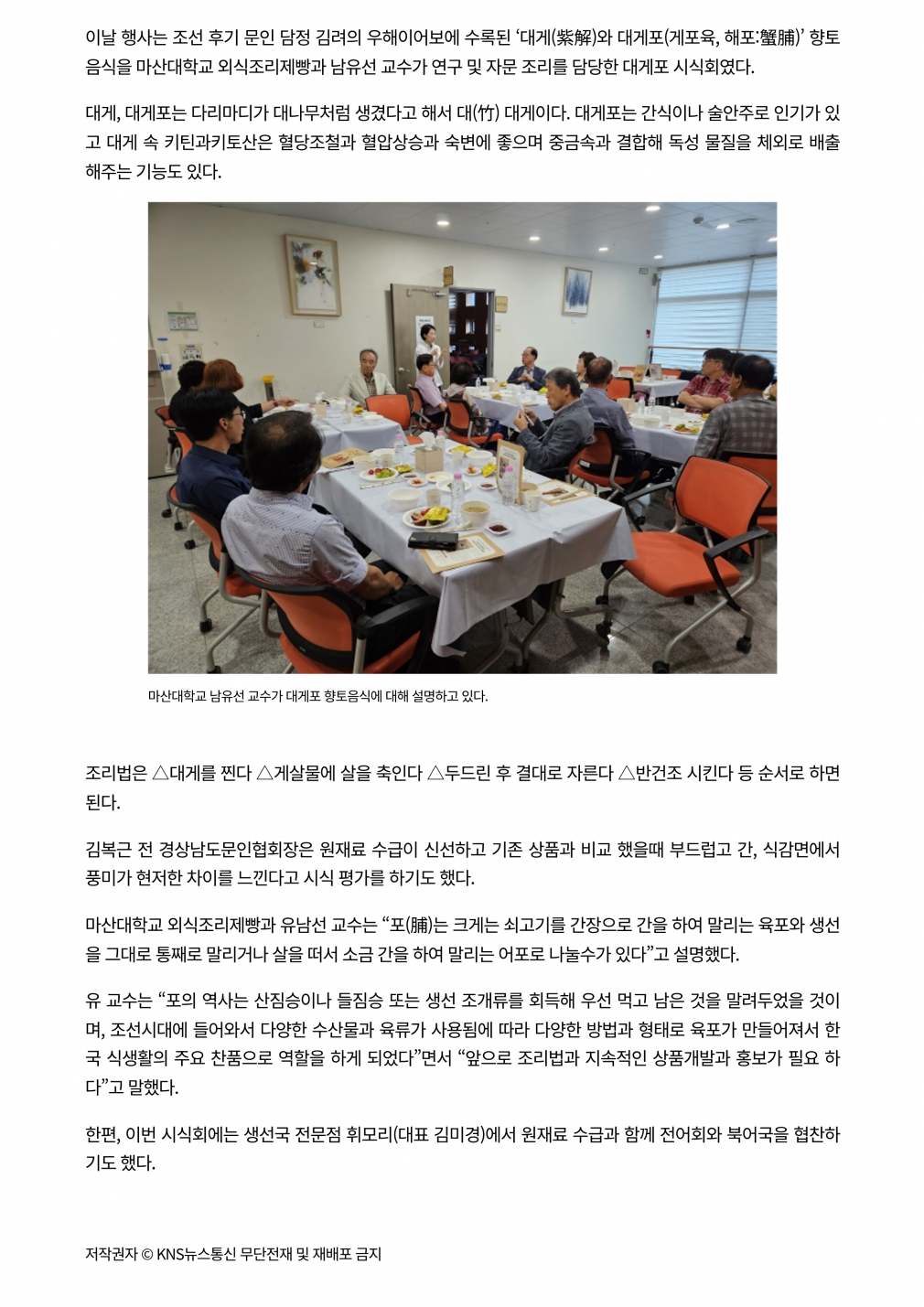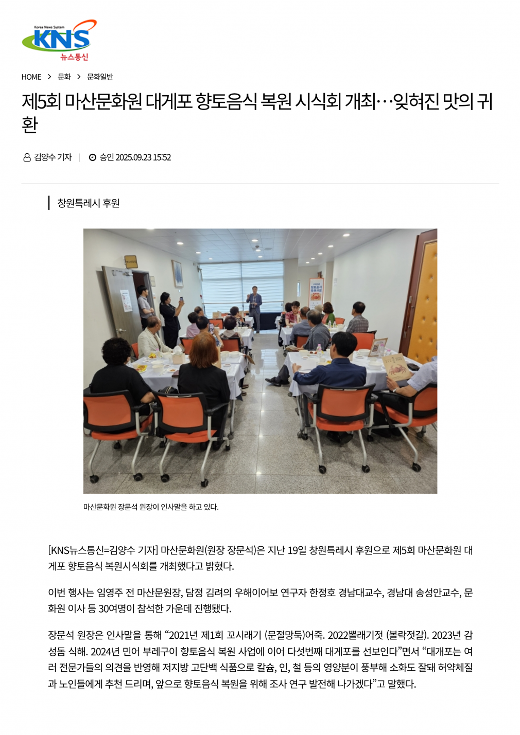 [KNS뉴스통신] 제5회 마산문화원 대게포 향토음식 복원 시식회 개최…잊혀진 맛의 귀환 페이지 정보 작성자 마산문화원 댓글 0건 조회 299회 작성일 25-09-24 09:11 본문 제5회 마산문화원 대게포 향토음식 복원 시식회 개최 목록 이전글[경남매일] 경남 사투리 인식 바뀌어야 문화유산 보존 길 열려 25.11.25 다음글[경남일보] ‘외국인 우리말 말하기 대회’ 개최 25.08.20