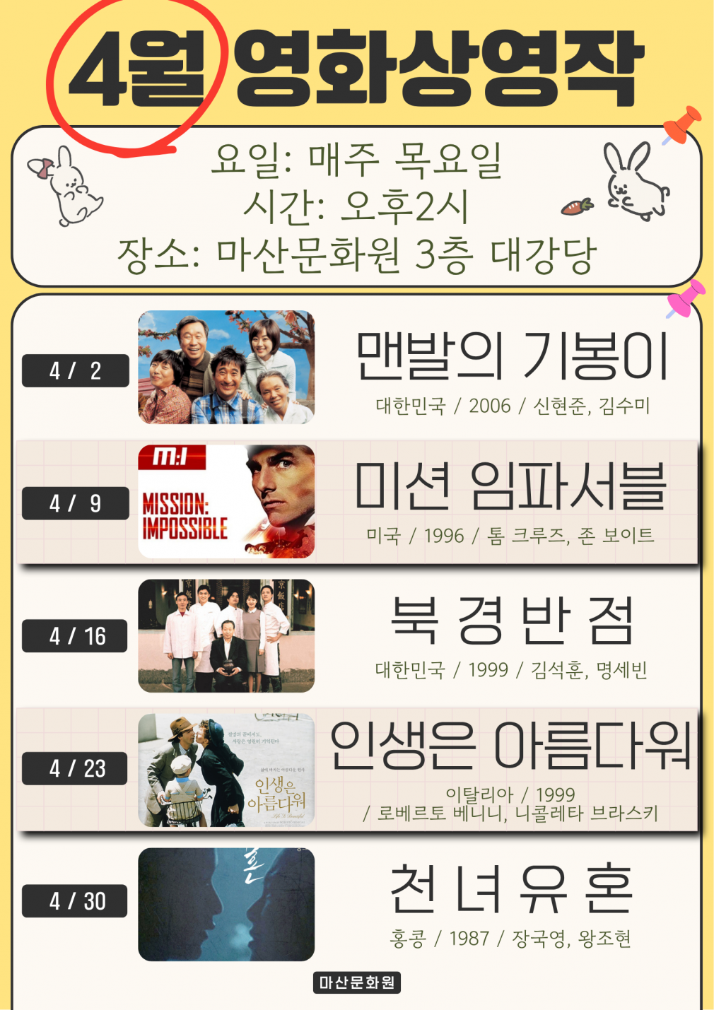 2026년 4월 무료영화상영작 안내 페이지 정보 작성자 마산문화원 댓글 0건 조회 5회 작성일 26-03-24 09:55 본문 4월 영화 상영작 안내입니다. *대강당 내 음식물 반입 및 취식 금지입니다. 목록 다음글제26회 마산휘호대회 안내 26.03.23