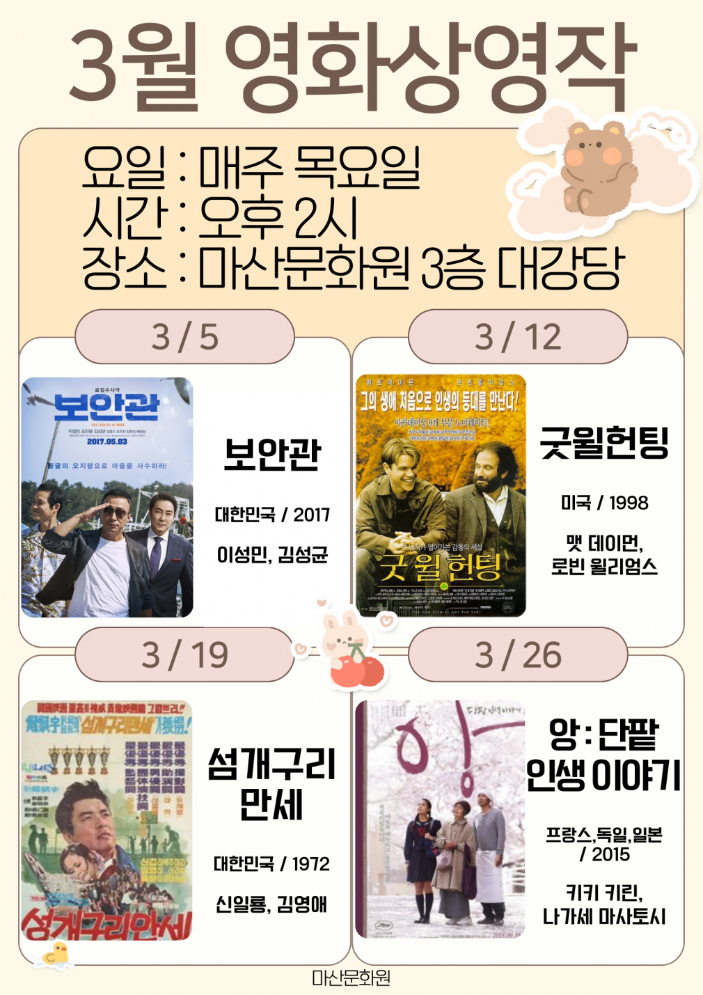 2026년 3월 무료영화상영작 안내 페이지 정보 작성자 마산문화원 댓글 0건 조회 197회 작성일 26-02-19 09:09 본문 3월 영화 상영작 안내입니다. *대강당 내 음식물 반입 및 취식 금지입니다. 목록 다음글2026년 44기 문화대학 입학식 안내 26.01.27