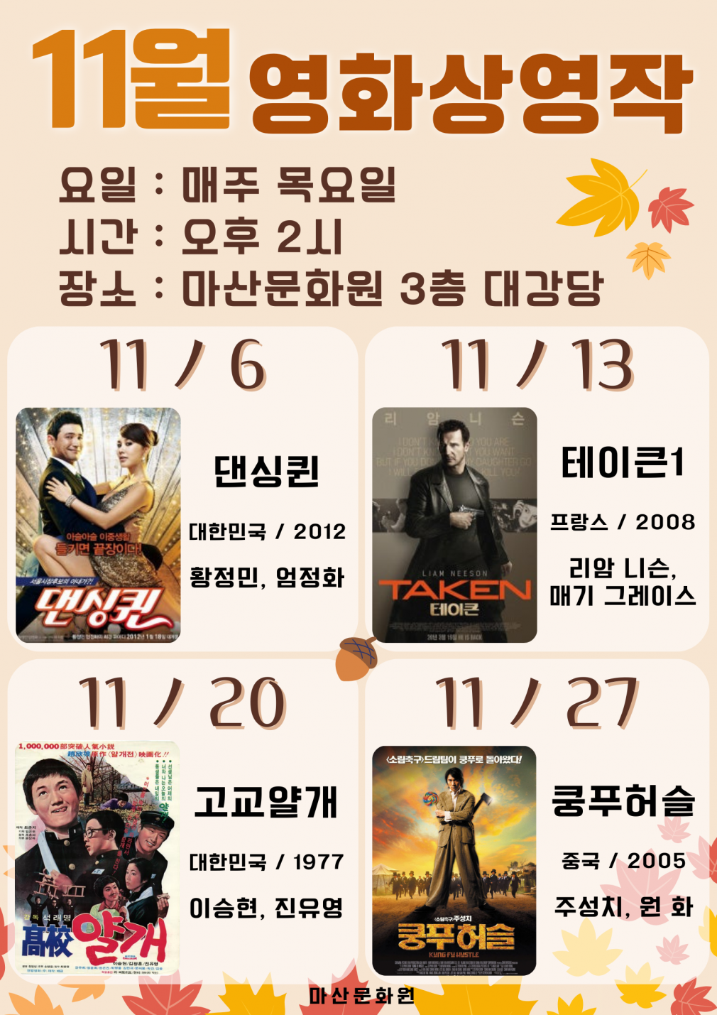 2025년 11월 무료영화상영작 안내 페이지 정보 작성자 마산문화원 댓글 0건 조회 472회 작성일 25-10-20 09:51 본문 11월 영화 상영작 안내입니다. *대강당 내 음식물 반입 및 취식 금지입니다. 목록 이전글2025년 제54회 청소년 문예작품공모전 입상자 발표 25.11.06 다음글2025년 10월 무료영화상영작 안내 25.09.29