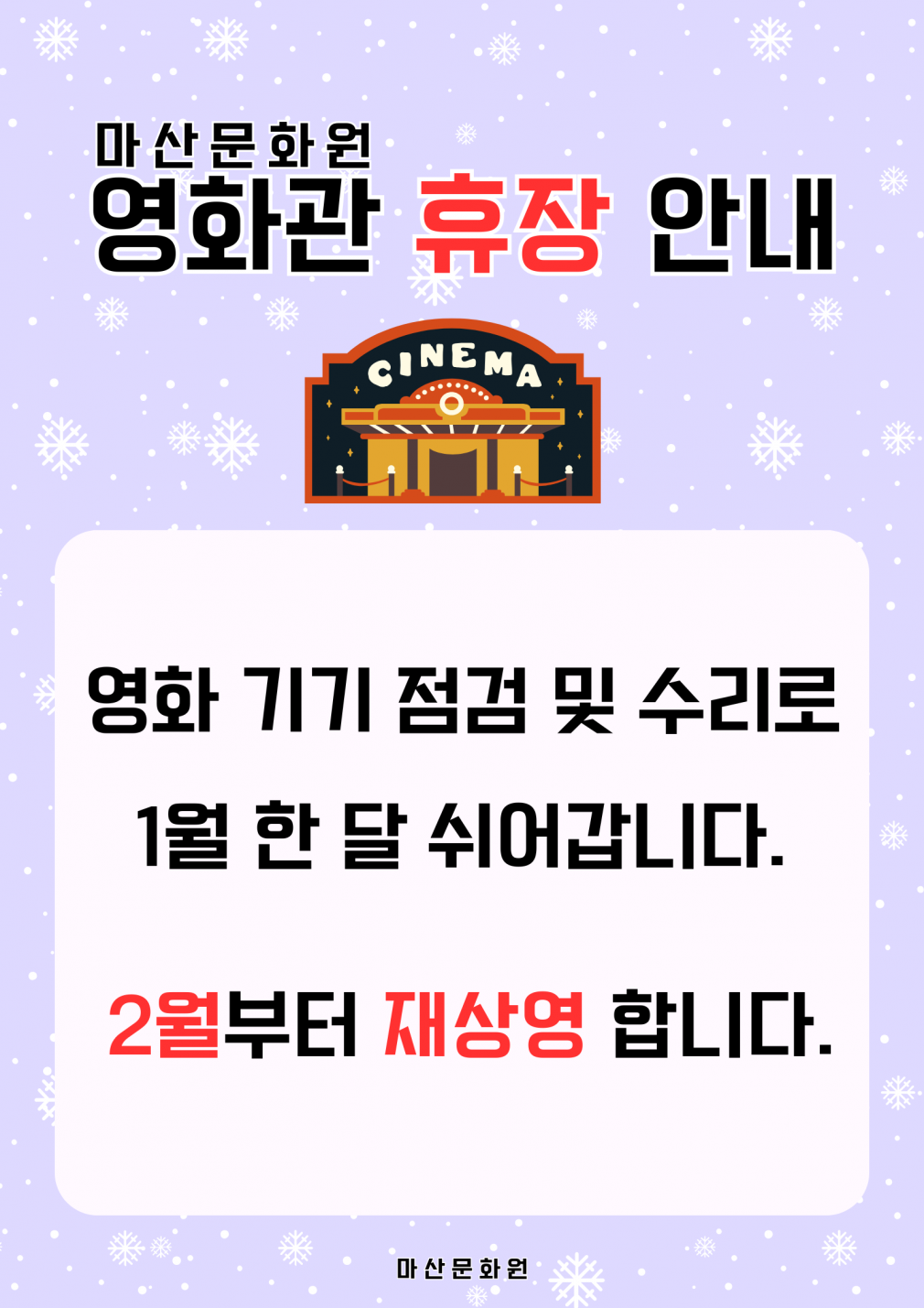 2026년 1월 무료영화상영 휴관 안내 페이지 정보 작성자 마산문화원 댓글 0건 조회 152회 작성일 25-12-23 09:19 본문 영화 기기 점검 및 수리로 1월 한 달 쉬어갑니다. 2월부터 재상영 합니다. 목록 이전글마산문화대학 제44기 신입생 모집 마감 26.01.05 다음글마산문화대학 제44기 신입생 모집 안내 25.12.02