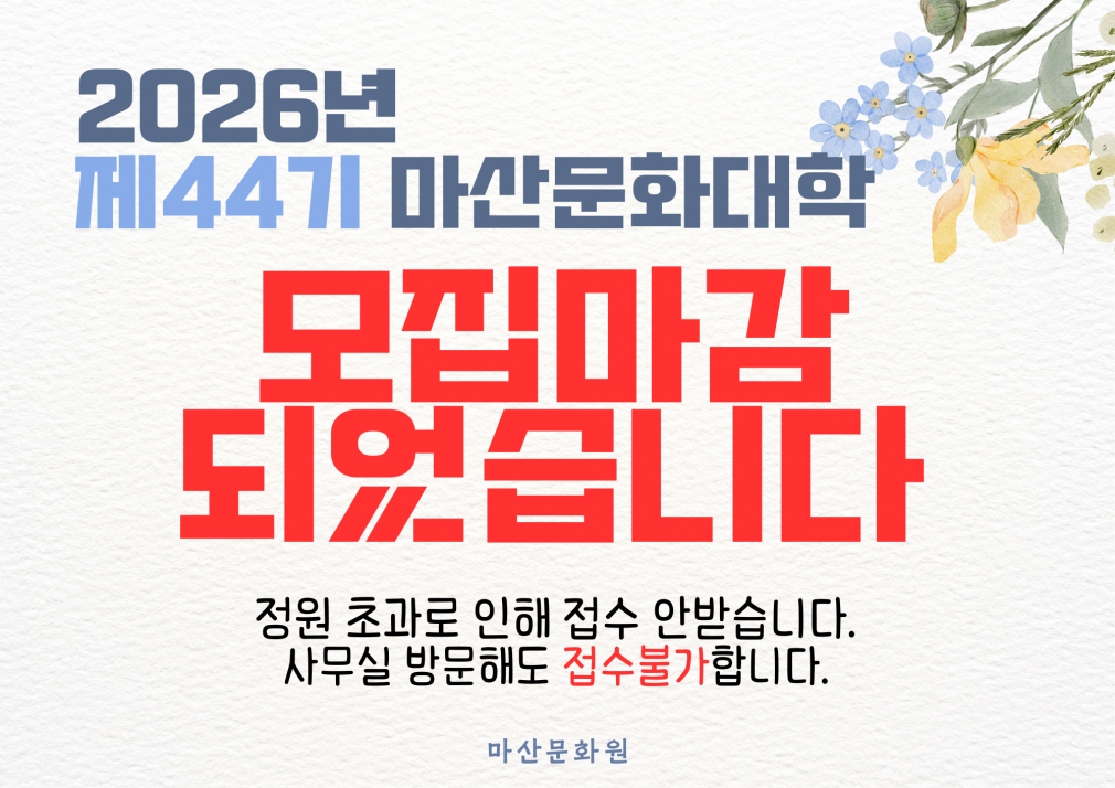 마산문화대학 제44기 신입생 모집 마감 페이지 정보 작성자 마산문화원 댓글 0건 조회 157회 작성일 26-01-05 12:53 본문 마산문화대학 제44기 신인생 모집이 마감되었습니다. *선착순 200명 정원초과로 인해 사무실 방문해도 접수불가합니다. 목록 이전글2026년 2월 무료영화상영작 안내 26.01.21 다음글2026년 1월 무료영화상영 휴관 안내 25.12.23
