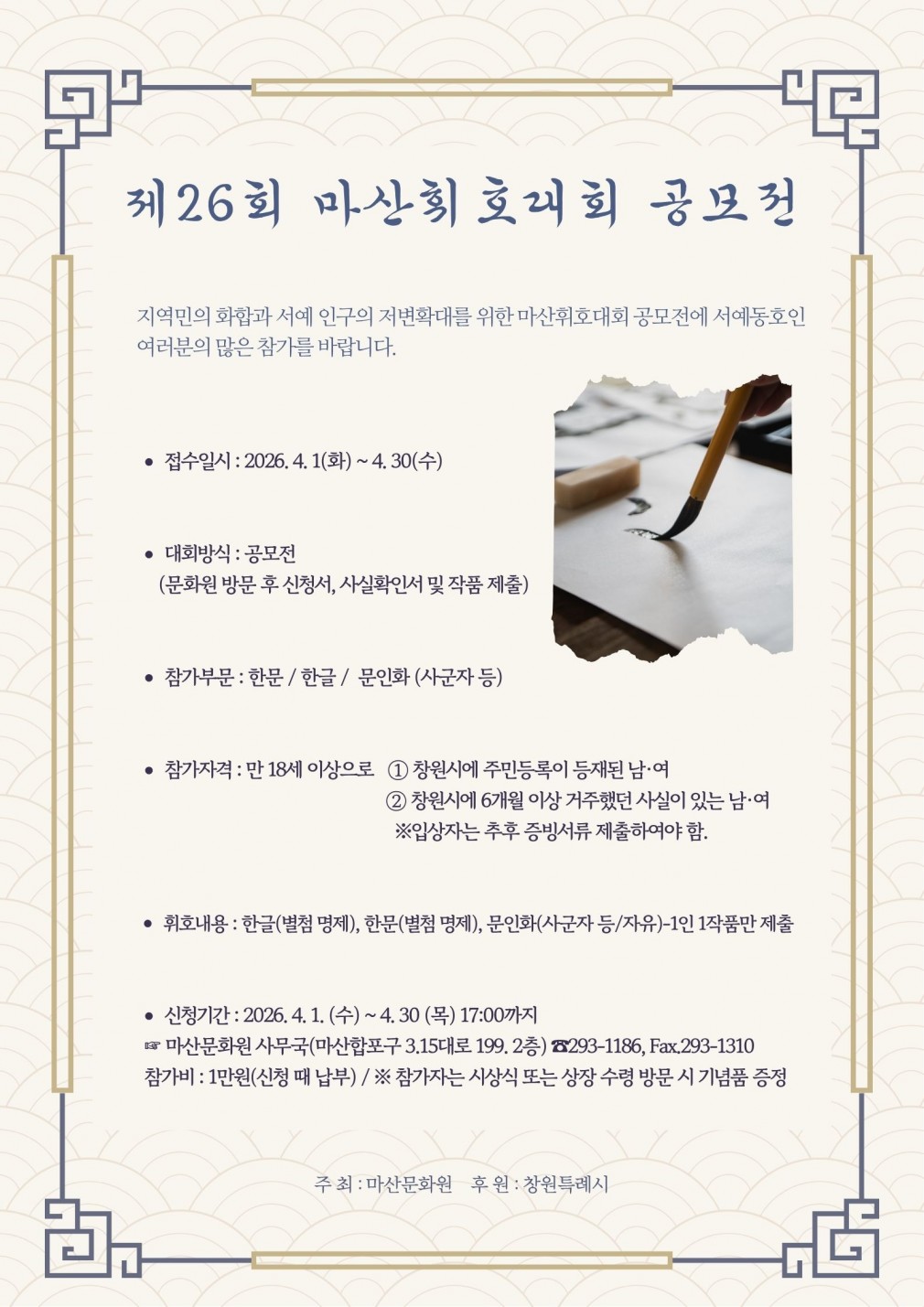2026년 제26회 마산휘호대회 안내 페이지 정보 작성자 마산문화원 댓글 0건 조회 141회 작성일 26-03-23 10:39 본문 . 첨부파일 [마산문화원]제26회휘호대회대회요강신청서,명제,사실확인서포함 1.hwp (266.5K) 52회 다운로드 | DATE : 2026-03-31 10:40:52 목록 이전글2026년 4월 무료영화상영작 안내 26.03.24 다음글2026년 3월 무료영화상영작 안내 26.02.19
